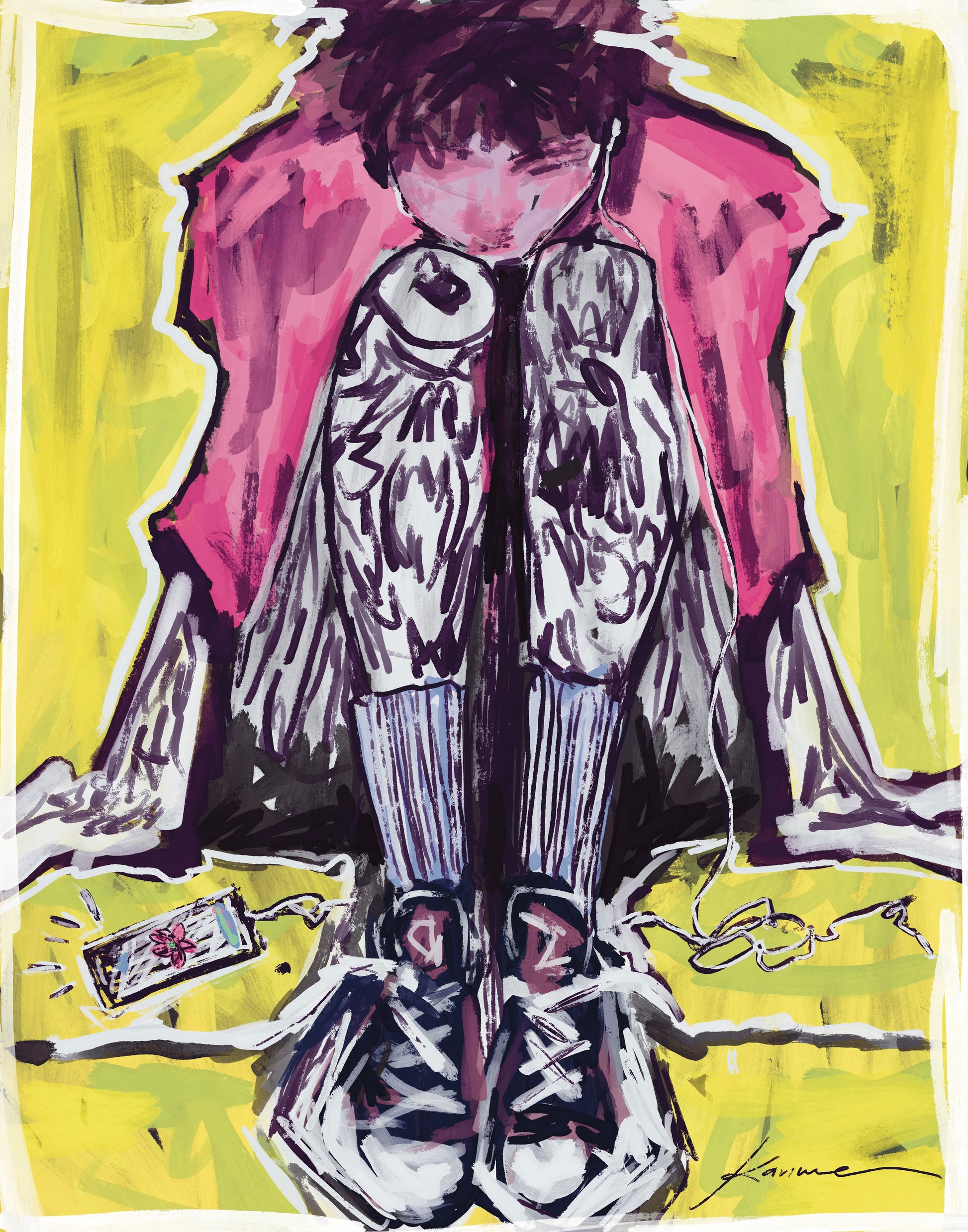 él carga un silencio que parece más pesado que el hoodie rosa.